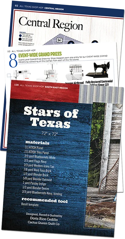 The All Texas Shop Hop™ Magazine is your guide to all things about the event. In addition, you will find patterns, articles and resources for sewing and quilting. Your magazine will be a great reference even after the Shop Hop has ended. Use it as inspiration for a new project, or to find a quilt shop as you meander through Texas.